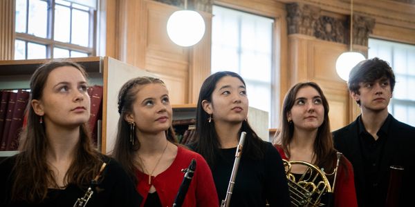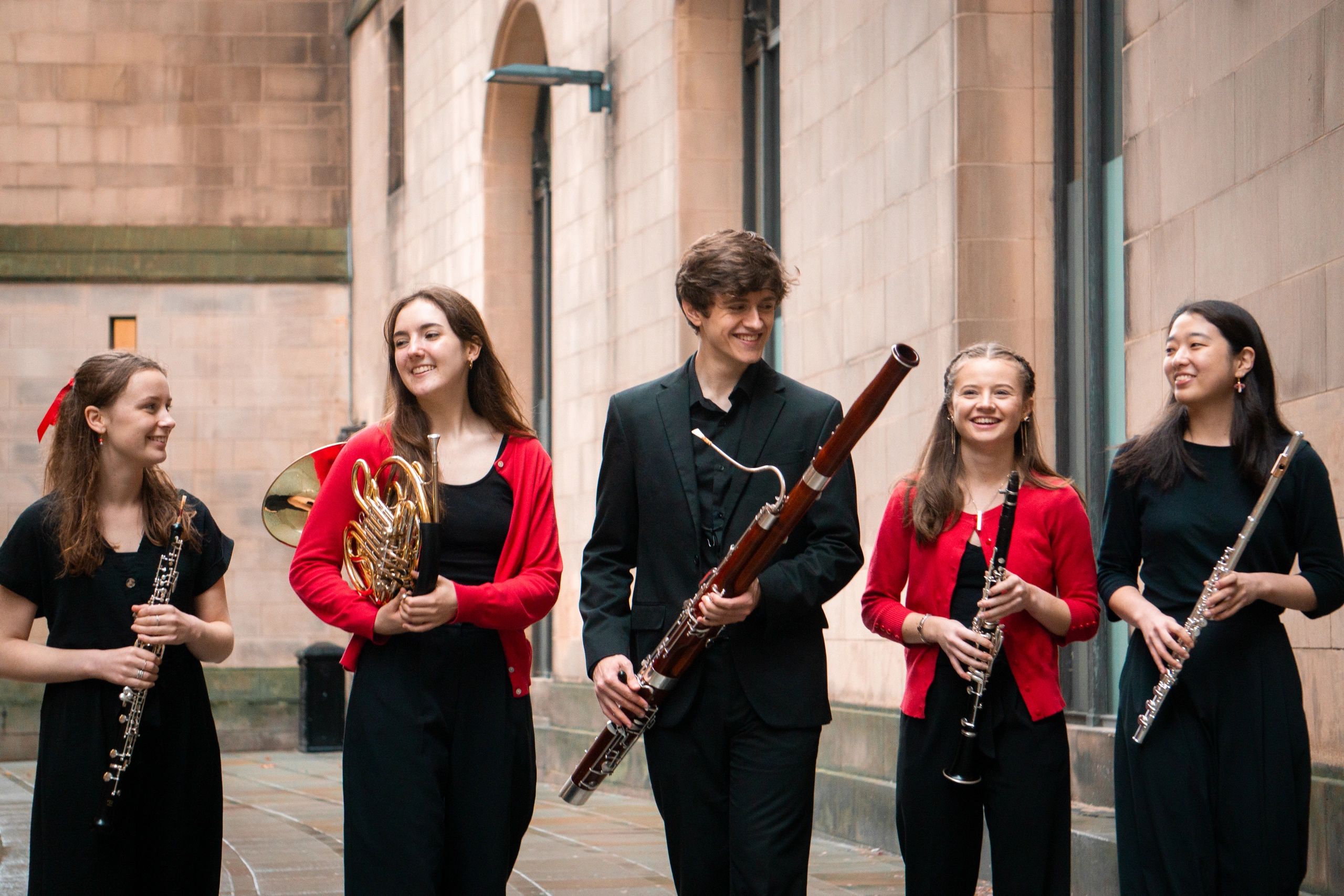 L-R: Anna Turner (oboe), Esmé MacBride-Stewart (horn), Connor Huss (bassoon), Cara Smith (clarinet), Kaoruko Takehara (flute)